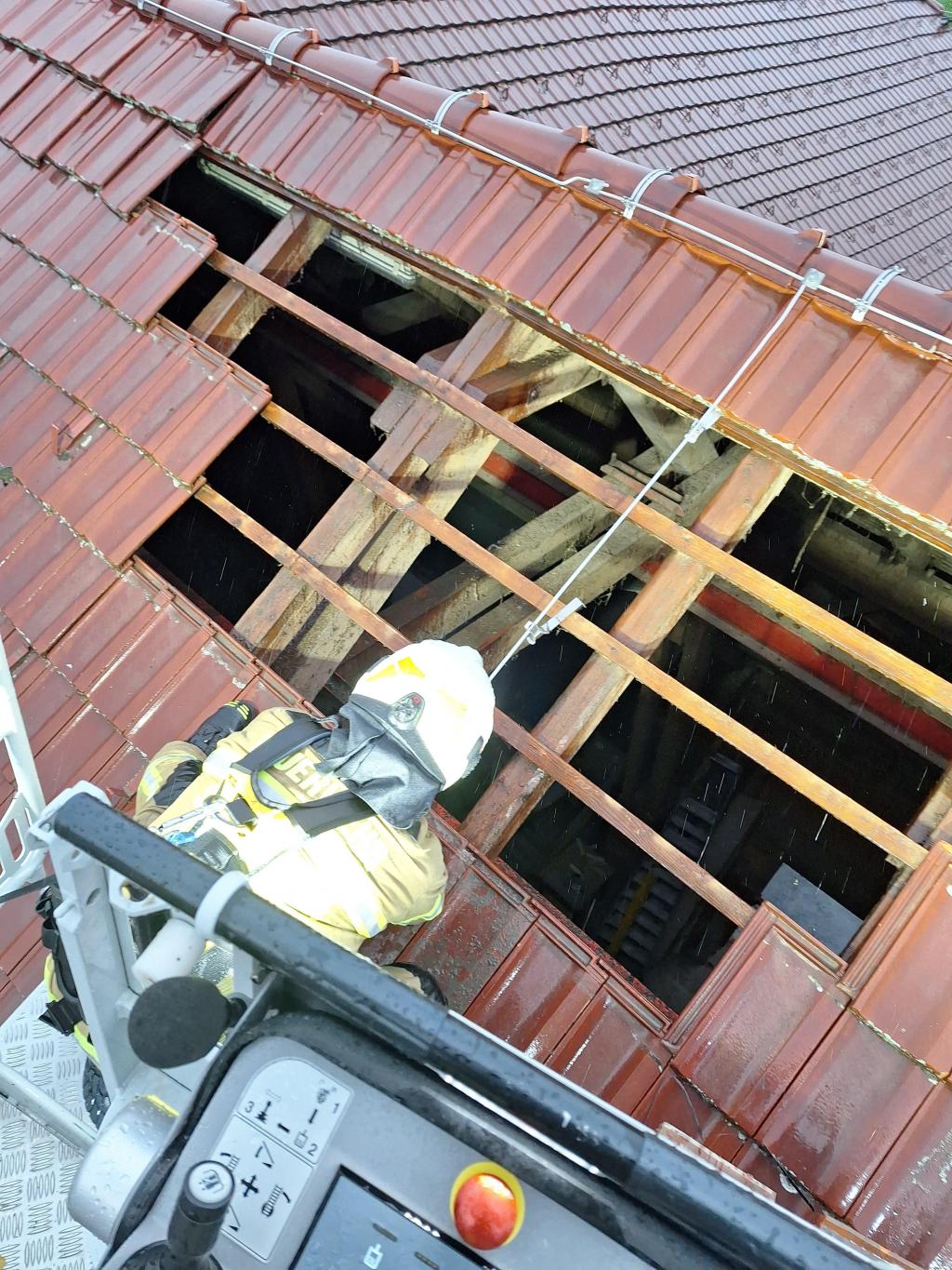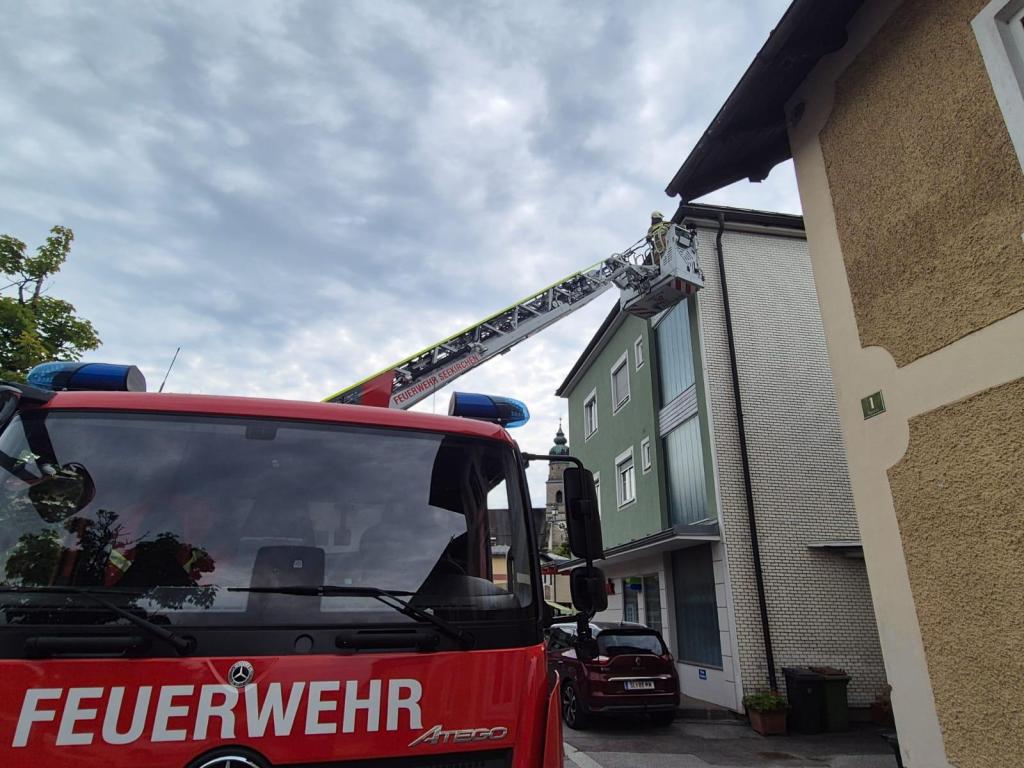 Während der Einsatznachbesprechung wurde die Drehleiter zu einem abgedeckten Wirtschaftsgebäude in Henndorf angefordert.
