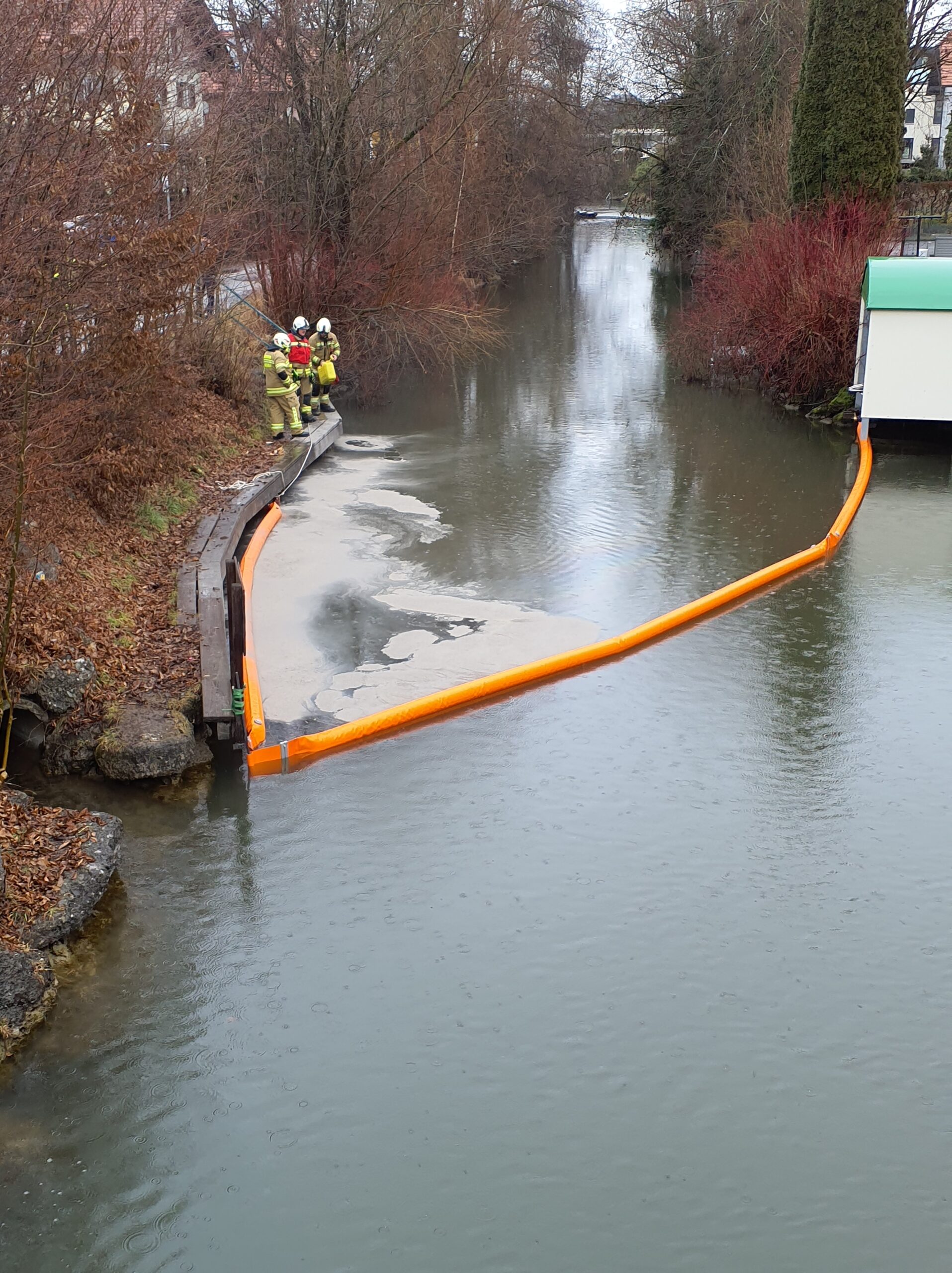 Um 13:32 wurde die Hauptwache mit dem Einsatzstichwort ‚Öl auf der Fischach‘ alarmiert. Aus einem Oberflächenkanal trat aus bisher unbekannter Ursache Diesel in die Fischach. Wir bauten eine Ölsperre im Bereich Fischachbrücke auf um die ausgeflossenen Betriebsmittel aufzufangen und zu Binden.