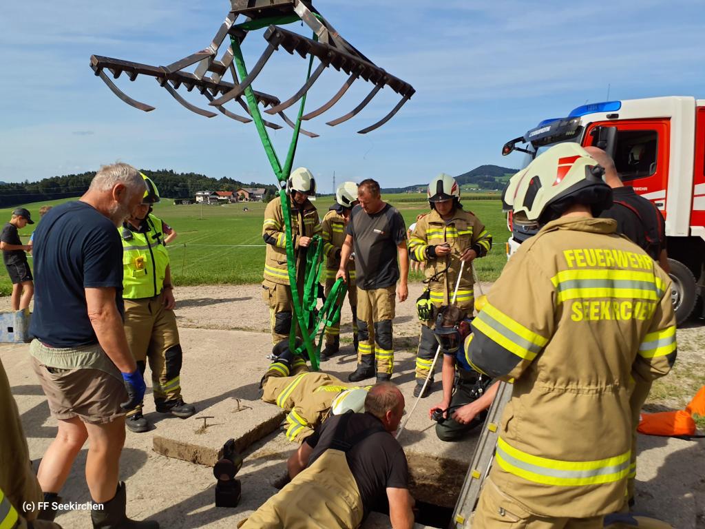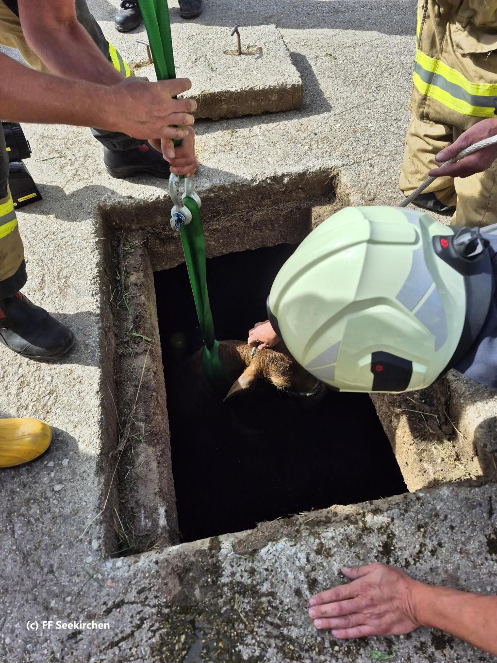 Am 25. August 2025 um 15:19 Uhr wurden der Löschzug Schöngumprechting und die Hauptwache der Freiwilligen Feuerwehr Seekirchen alarmiert: Ein Kalb war in eine Güllegrube gestürzt. Sofort belüfteten die Einsatzkräfte die Grube mit einem Drucklüfter. Anschließend stiegen Atemschutzträger in die Grube hinab, um das Kalb mit Gurten zu sichern. Bereits 15 Minuten nach der Alarmierung konnte das Jungtier mithilfe eines Krans gerettet und in Sicherheit gebracht werden.