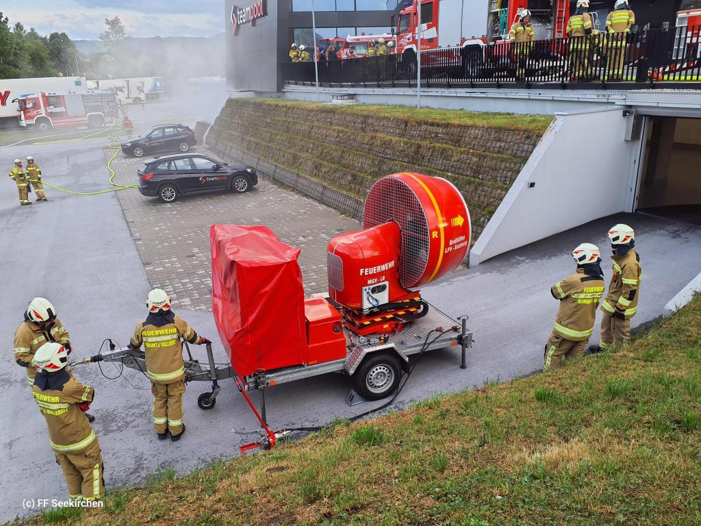 Um die Tiefgarage rauchfrei zu bekommen, unterstützten uns die Kameraden der Freiwilligen Feuerwehr Neumarkt am Wallersee mit einem Großlüfter. Nach gut eineinhalb Stunden konnte die Übung erfolgreich abgeschlossen werden.